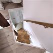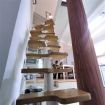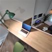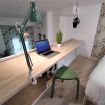En la parte inferior tenemos una terraza con mesa de comedor, salón, cocina y baño. Subiendo la escalera, el dormitorio y la zona de trabajo.