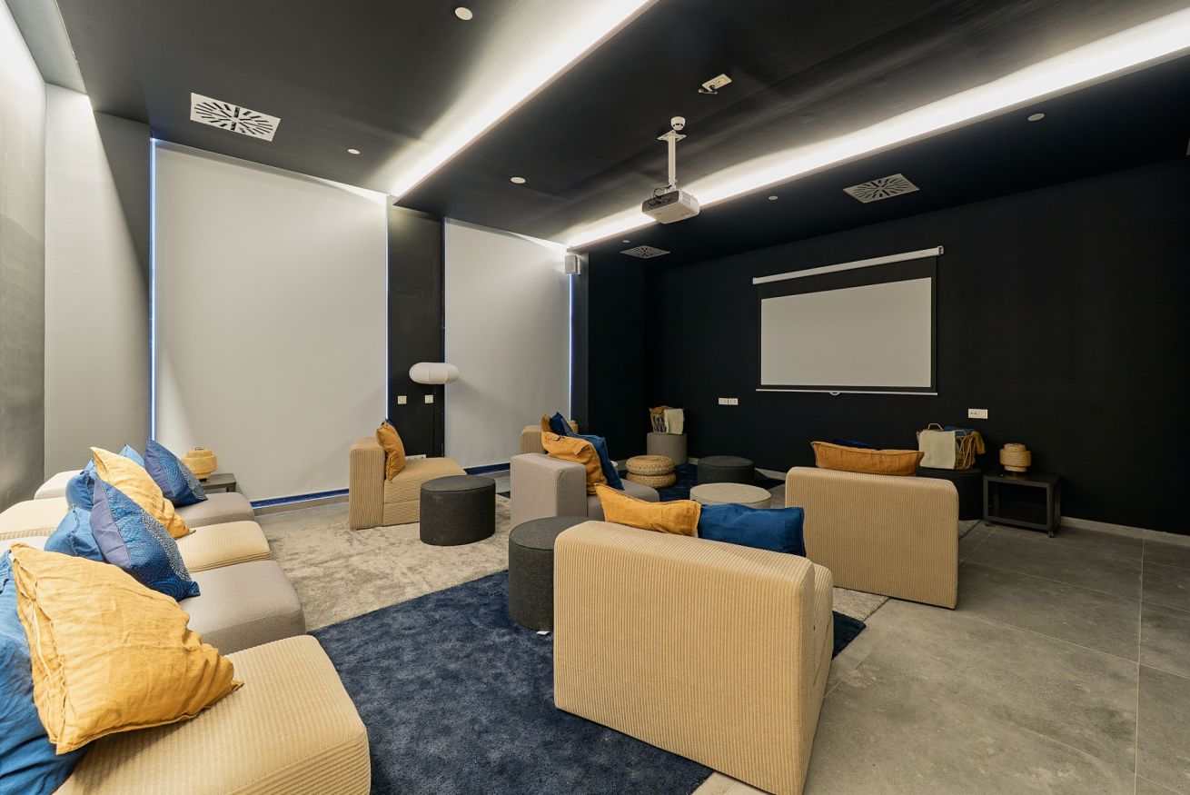 Upon entering the building you will find a very bright coworking area, gym, children's area and even a movie screen.